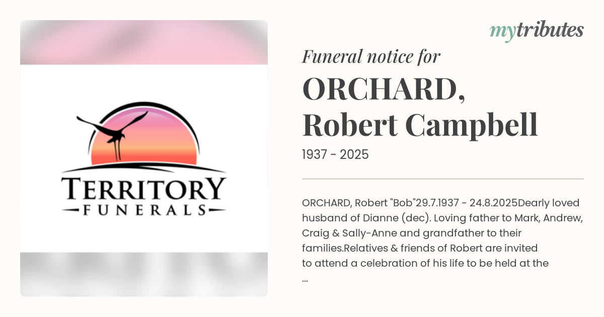 Relatives & friends of Robert are invited to attend a celebration of his life to be held at the Thorak Chapel, Deloraine Rd Knuckey Lagoon on Monday 1 September 2025 @ 10.30am.