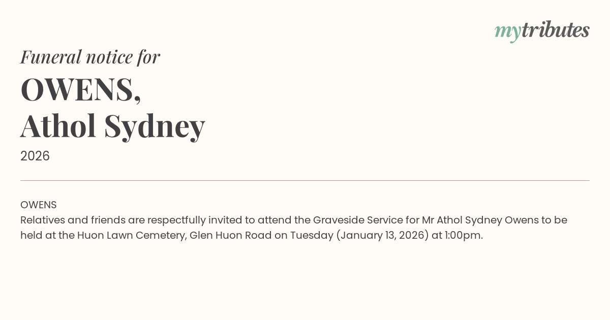 Relatives and friends are respectfully invited to attend the Graveside Service for Mr Athol Sydney Owens to be held at the Huon Lawn Cemetery, Glen Huon Road on Tuesday (January 13, 2026) at 1:00pm.