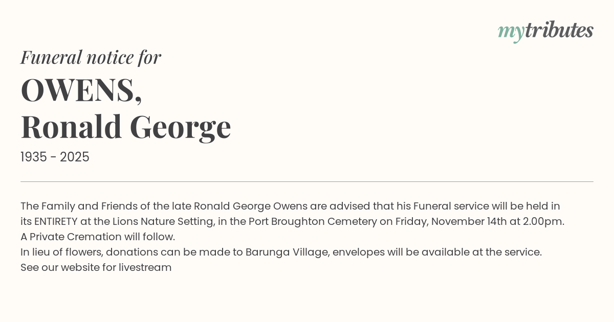 15°CThe Family and Friends of the late Ronald George Owens are advised that his Funeral service will be held in its ENTIRETY at the Lion’s Nature Setting, in the Port Broughton Cemetery on Friday, November 14th at 2.00pm.