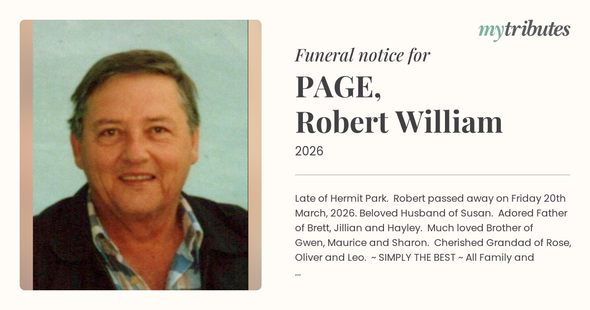 15°CLate of Hermit Park. Robert passed away on Friday 20th March, 2026. Beloved Husband of Susan. Adored Father of Brett, Jillian and Hayley. Much loved Brother of Gwen, Maurice and Sharon. Cherished Grandad of Rose, Oliver and Leo.