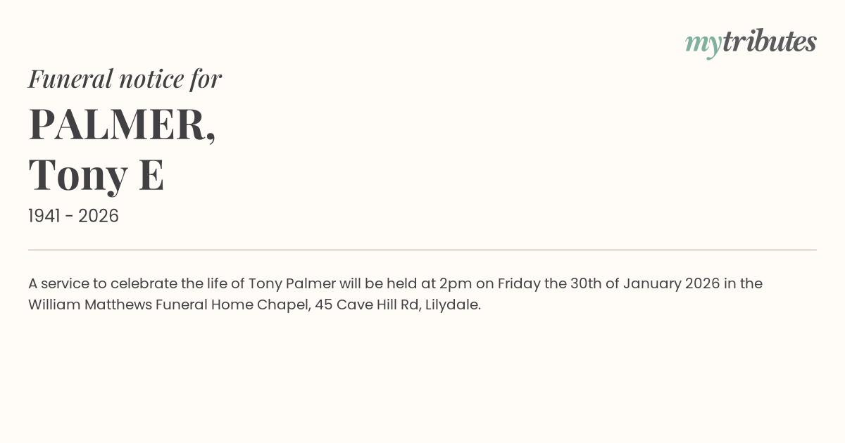 15°CA service to celebrate the life of Tony Palmer will be held at 2pm on Friday the 30th of January 2026 in the William Matthews Funeral Home Chapel, 45 Cave Hill Rd, Lilydale.