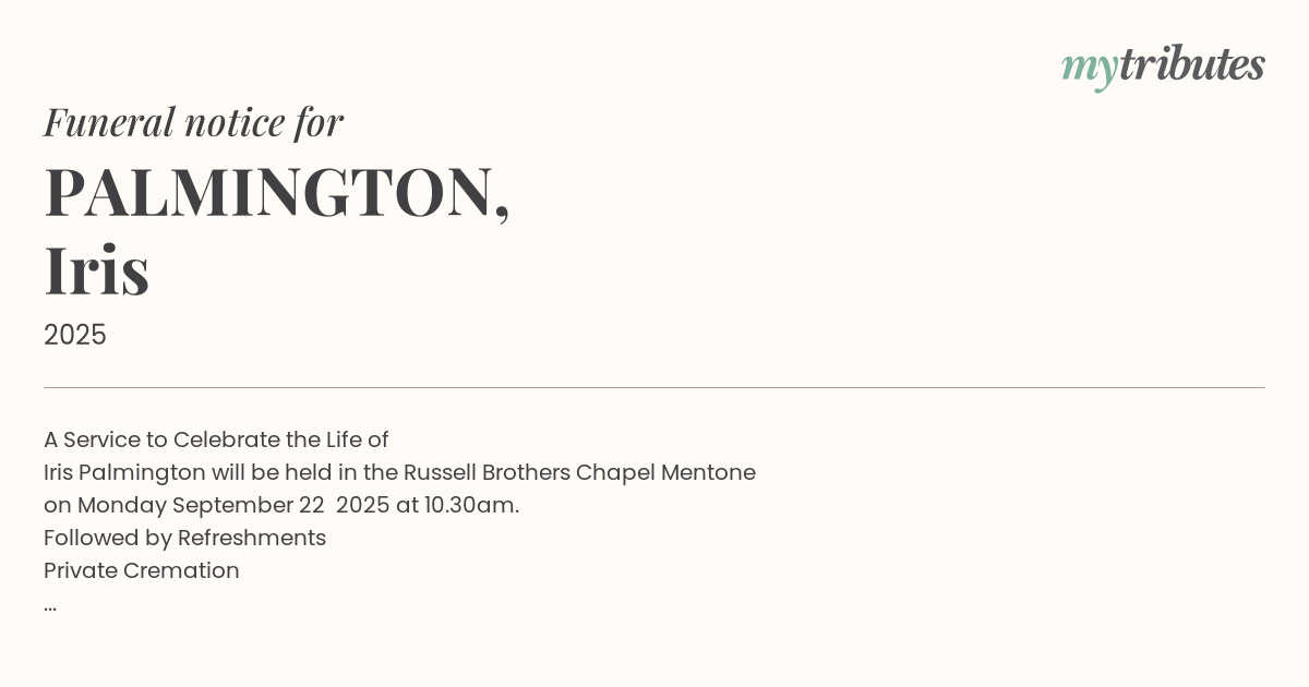 Iris Palmington will be held in the Russell Brothers Chapel Mentone