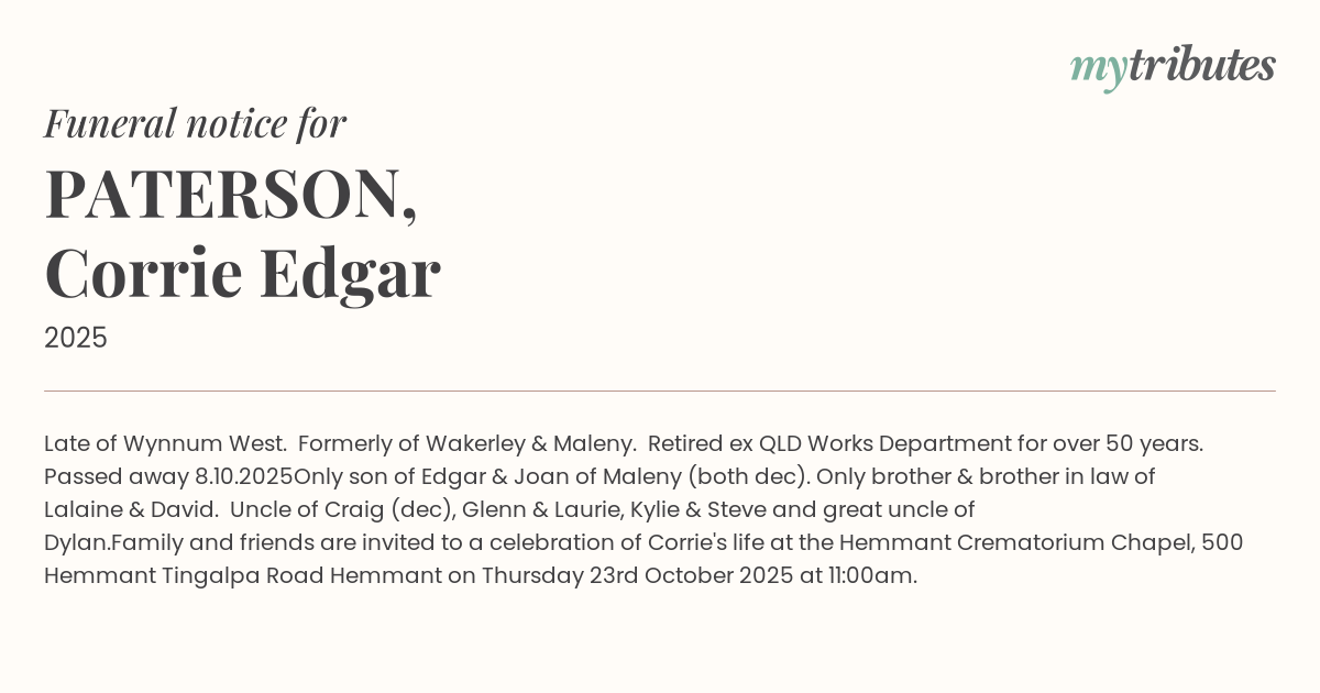 Family and friends are invited to a celebration of Corrie's life at the Hemmant Crematorium Chapel, 500 Hemmant Tingalpa Road Hemmant on Thursday 23rd October 2025 at 11:00am.