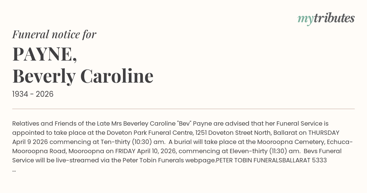 15°CRelatives and Friends of the Late Mrs Beverley Caroline "Bev" Payne are advised that her Funeral Service is appointed to take place at the Doveton Park Funeral Centre, 1251 Doveton Street North, Ballarat on THURSDAY April 9 2026 commencing at Ten-thirty (10:30) am.