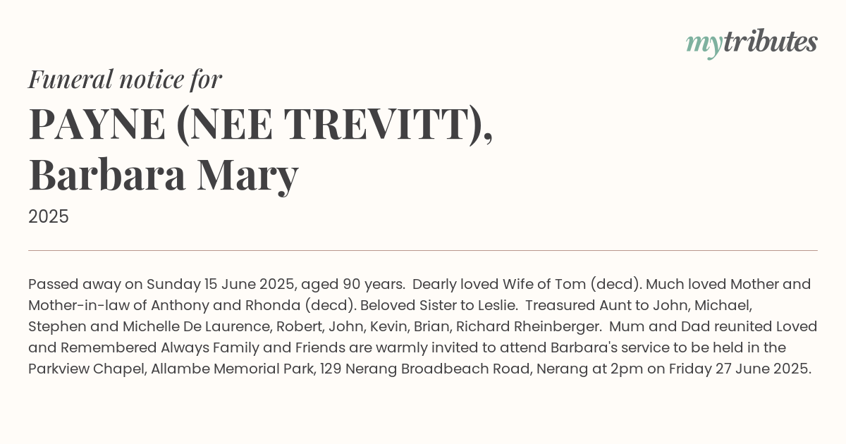 Family and Friends are warmly invited to attend Barbara's service to be held in the Parkview Chapel, Allambe Memorial Park, 129 Nerang Broadbeach Road, Nerang at 2pm on Friday 27 June 2025.