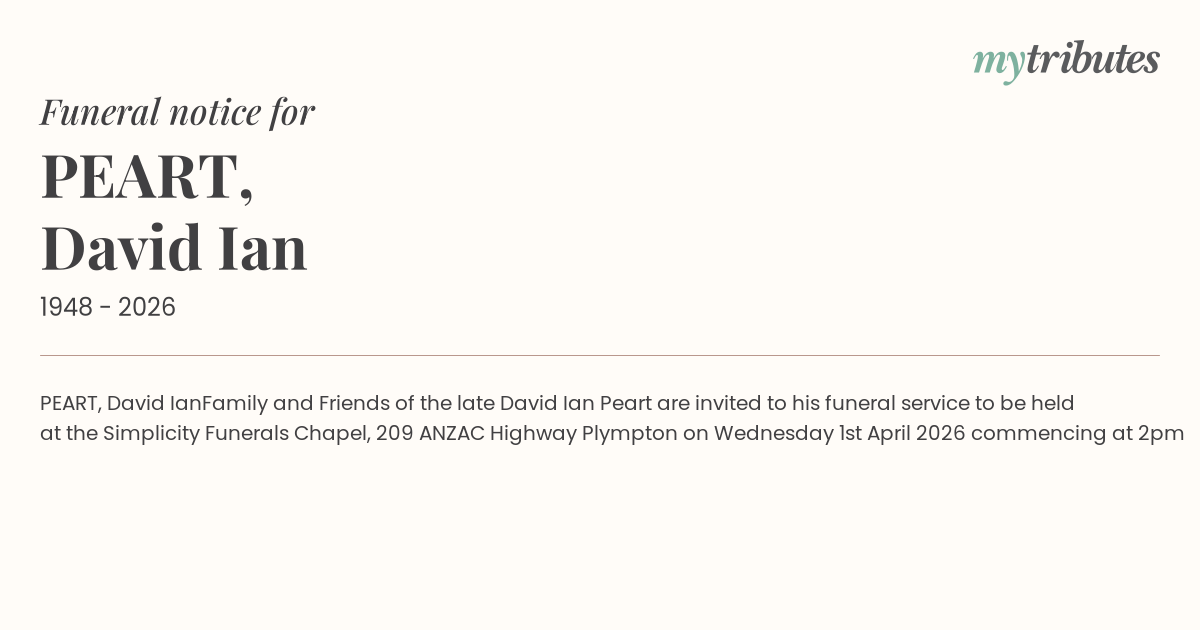 Family and Friends of the late David Ian Peart are invited to his funeral service to be held at the Simplicity Funerals Chapel, 209 ANZAC Highway Plympton on Wednesday 1st April 2026 commencing at 2pm