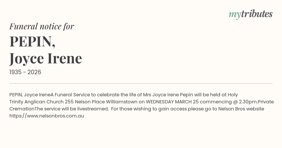 A Funeral Service to celebrate the life of Mrs Joyce Irene Pepin will be held at Holy Trinity Anglican Church 255 Nelson Place Williamstown on WEDNESDAY MARCH 25 commencing @ 2.30pm.