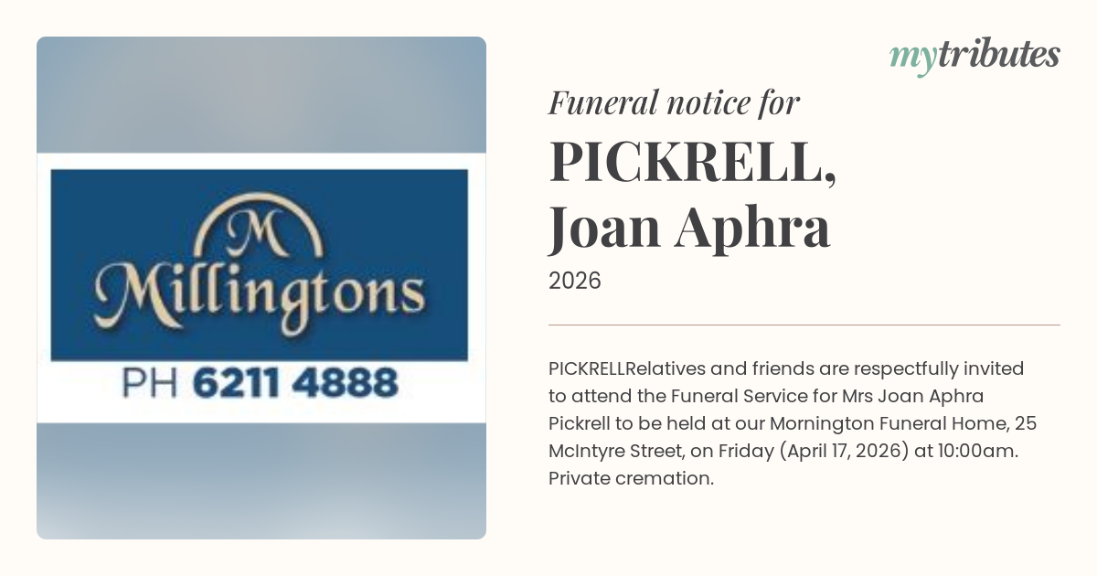Relatives and friends are respectfully invited to attend the Funeral Service for Mrs Joan Aphra Pickrell to be held at our Mornington Funeral Home, 25 McIntyre Street, on Friday (April 17, 2026) at 10:00am.