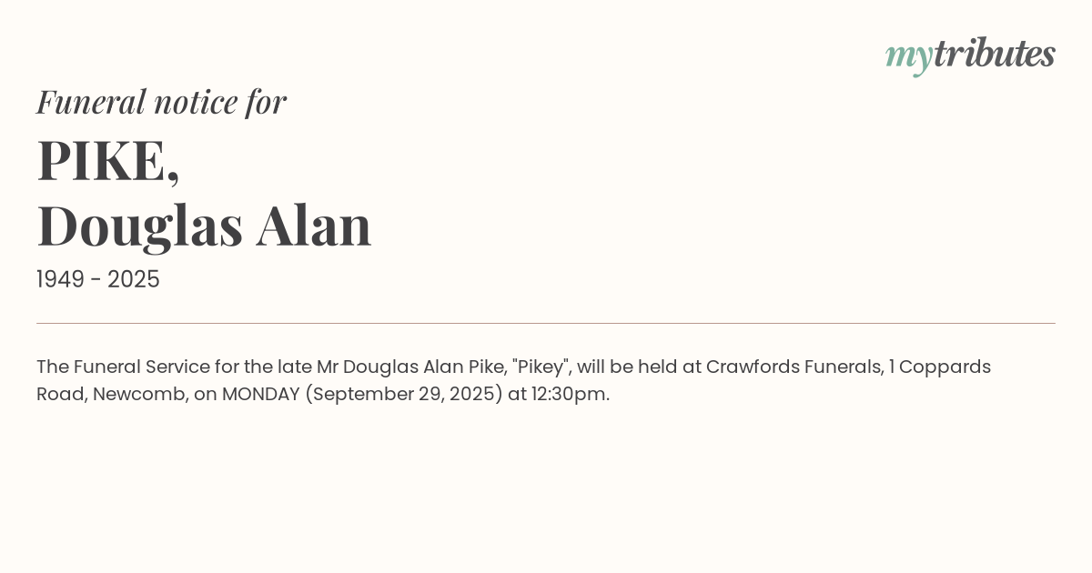 15°CThe Funeral Service for the late Mr Douglas Alan Pike, "Pikey", will be held at Crawfords Funerals, 1 Coppards Road, Newcomb, on MONDAY (September 29, 2025) at 12:30pm.