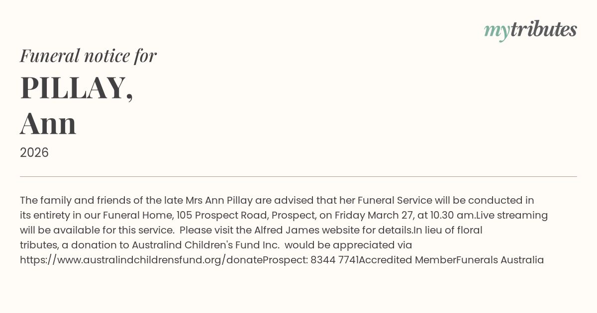 15°CThe family and friends of the late Mrs Ann Pillay are advised that her Funeral Service will be conducted in its entirety in our Funeral Home, 105 Prospect Road, Prospect, on Friday March 27, at 10.30 am.