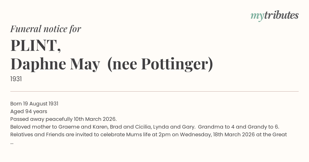 15°CBorn 19 August 1931 Aged 94 years Passed away peacefully 10th March 2026.