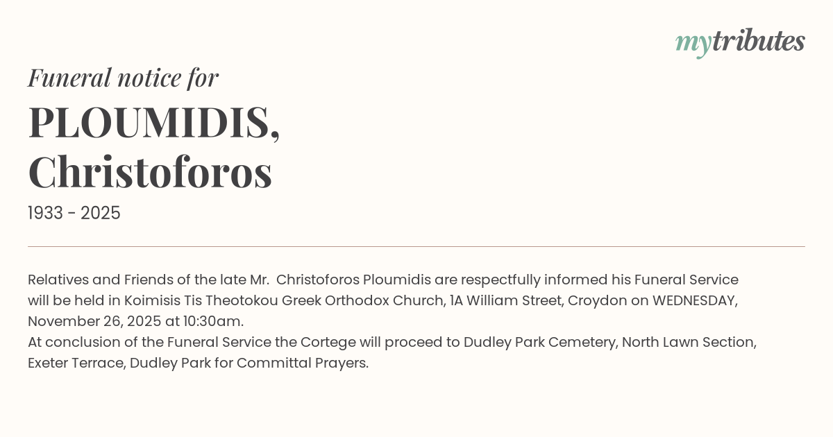 15°CRelatives and Friends of the late Mr. Christoforos Ploumidis are respectfully informed his Funeral Service will be held in Koimisis Tis Theotokou Greek Orthodox Church, 1A William Street, Croydon on WEDNESDAY, November 26, 2025 at 10:30am.
