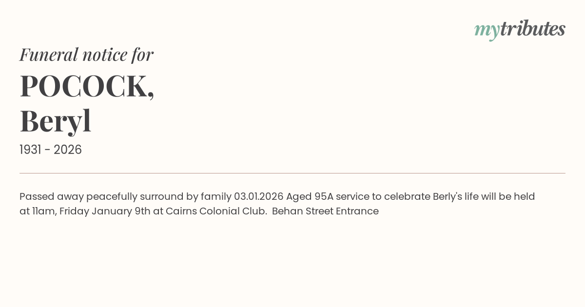 A service to celebrate Berly's life will be held at 11am, Friday January 9th at Cairns Colonial Club. Behan Street Entrance