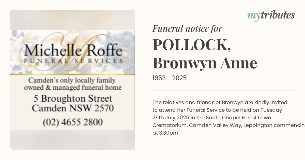 15°CThe relatives and friends of Bronwyn are kindly invited to attend her Funeral Service to be held on Tuesday 29th July 2025 in the South Chapel Forest Lawn Crematorium, Camden Valley Way, Leppington commencing at 3:30pm.