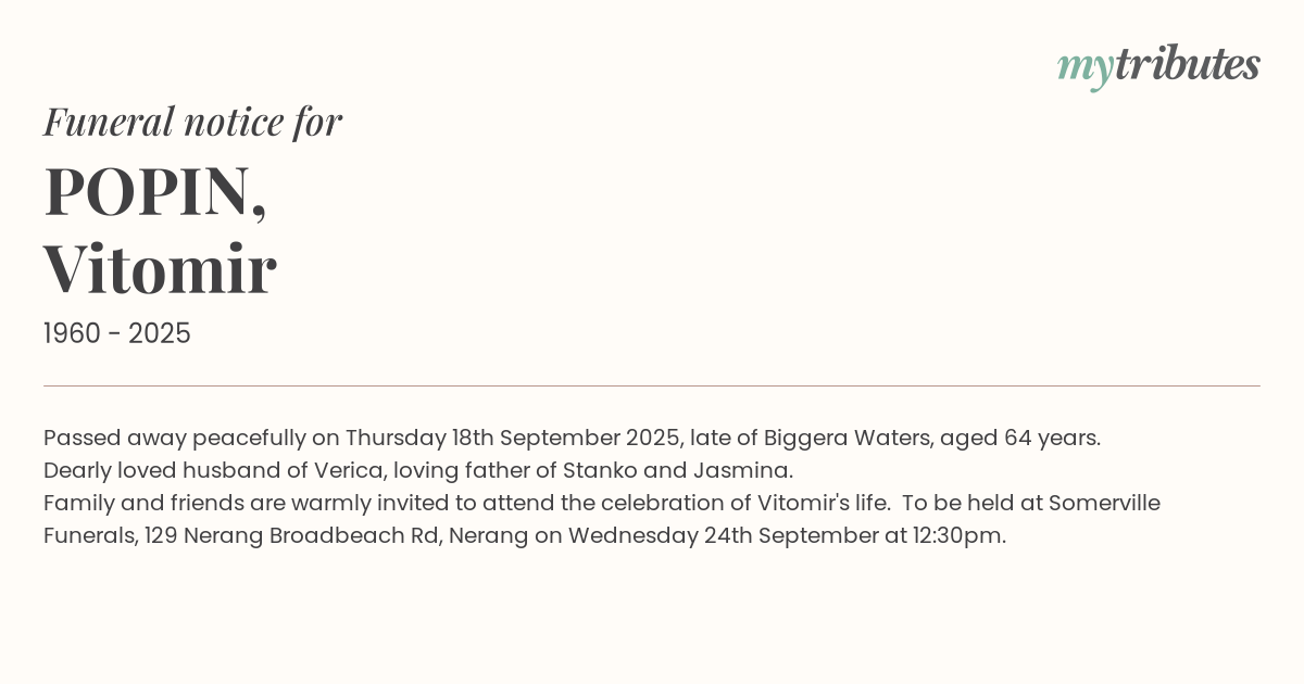 Family and friends are warmly invited to attend the celebration of Vitomir's life. To be held at Somerville Funerals, 129 Nerang Broadbeach Rd, Nerang on Wednesday 24th September at 12:30pm.