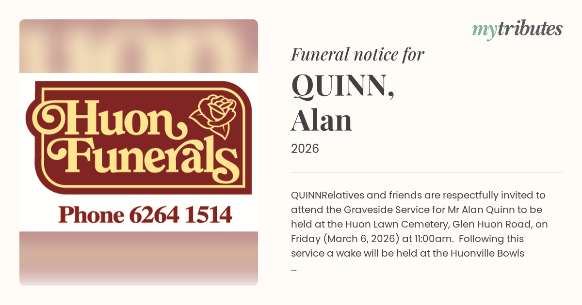 Relatives and friends are respectfully invited to attend the Graveside Service for Mr Alan Quinn to be held at the Huon Lawn Cemetery, Glen Huon Road, on Friday (March 6, 2026) at 11:00am. Following this service a wake will be held at the Huonville Bowls Club, 5 Sheild Street from 12:00pm.