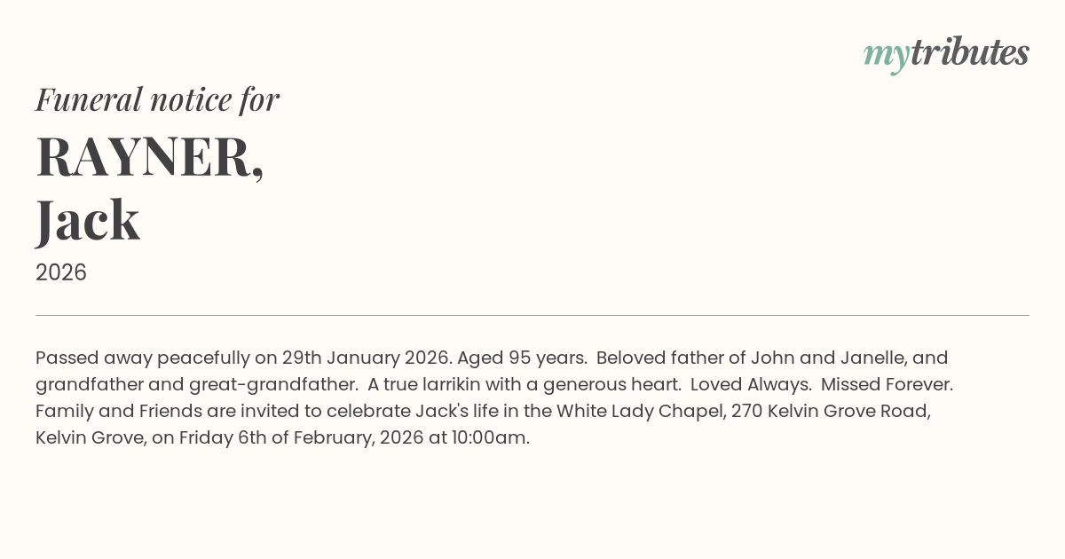 Family and Friends are invited to celebrate Jack's life in the White Lady Chapel, 270 Kelvin Grove Road, Kelvin Grove, on Friday 6th of February, 2026 at 10:00am.