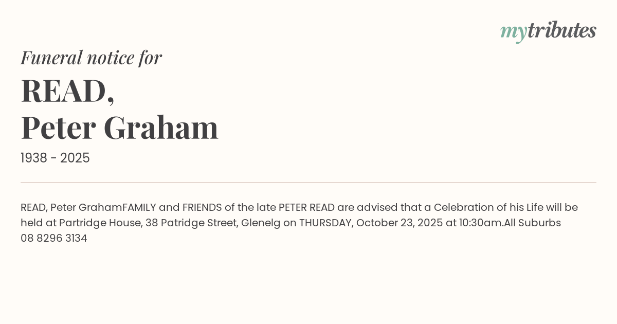 FAMILY and FRIENDS of the late PETER READ are advised that a Celebration of his Life will be held