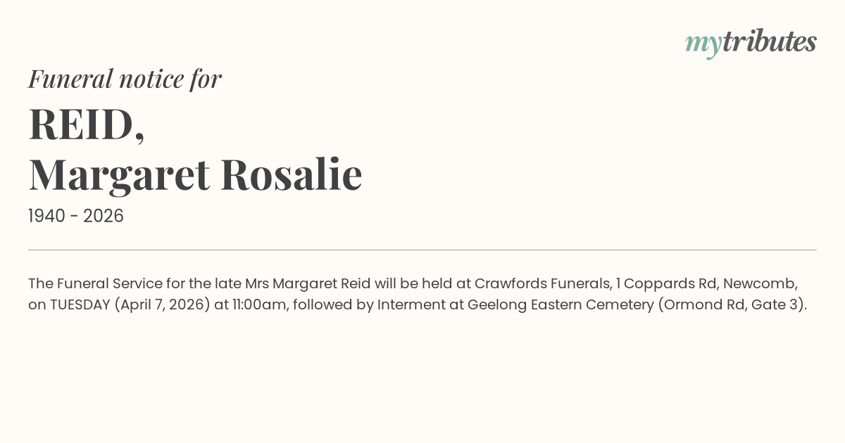 15°CThe Funeral Service for the late Mrs Margaret Reid will be held at Crawfords Funerals, 1 Coppards Rd, Newcomb, on TUESDAY (April 7, 2026) at 11:00am, followed by Interment at Geelong Eastern Cemetery (Ormond Rd, Gate 3).