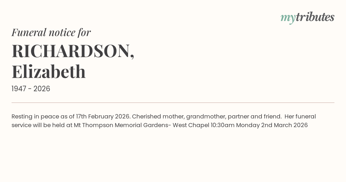 Her funeral service will be held at Mt Thompson Memorial Gardens- West Chapel 10:30am Monday 2nd March 2026