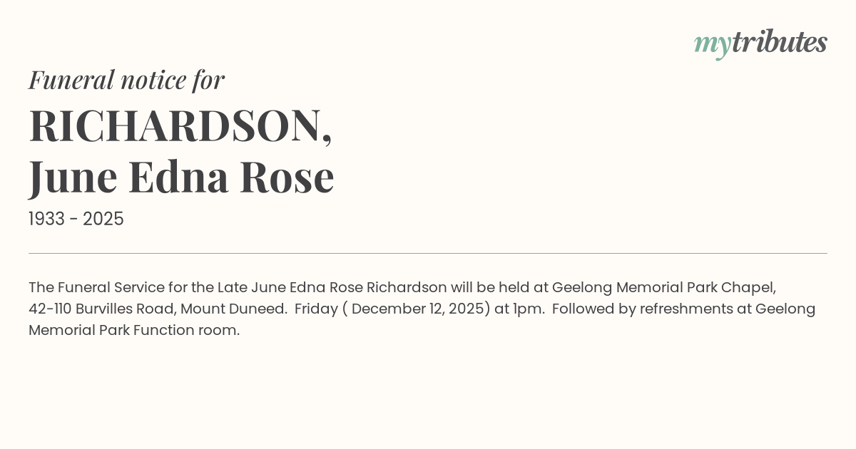 15°CThe Funeral Service for the Late June Edna Rose Richardson will be held at Geelong Memorial Park Chapel, 42-110 Burvilles Road, Mount Duneed. Friday ( December 12, 2025) at 1pm. Followed by refreshments at Geelong Memorial Park Function room.
