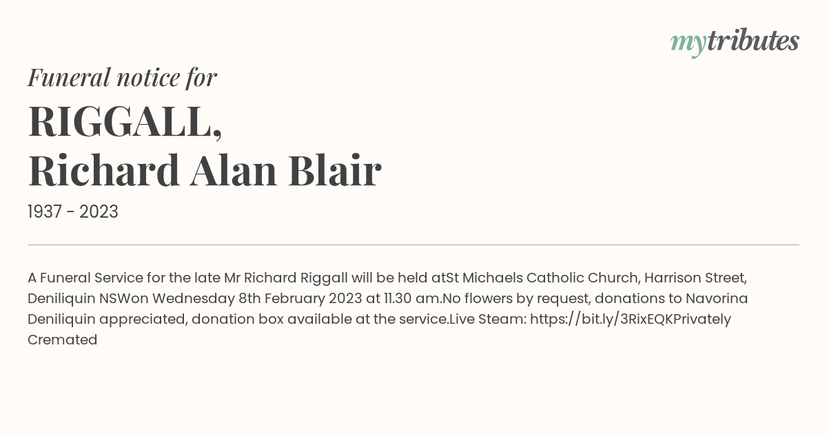 15°CA Funeral Service for the late Mr Richard Riggall will be held at