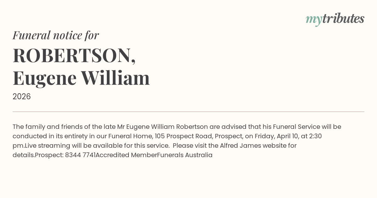 15°CThe family and friends of the late Mr Eugene William Robertson are advised that his Funeral Service will be conducted in its entirety in our Funeral Home, 105 Prospect Road, Prospect, on Friday, April 10, at 2:30 pm.