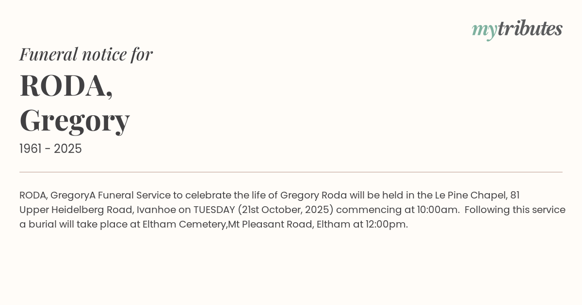 A Funeral Service to celebrate the life of Gregory Roda will be held in the Le Pine Chapel,