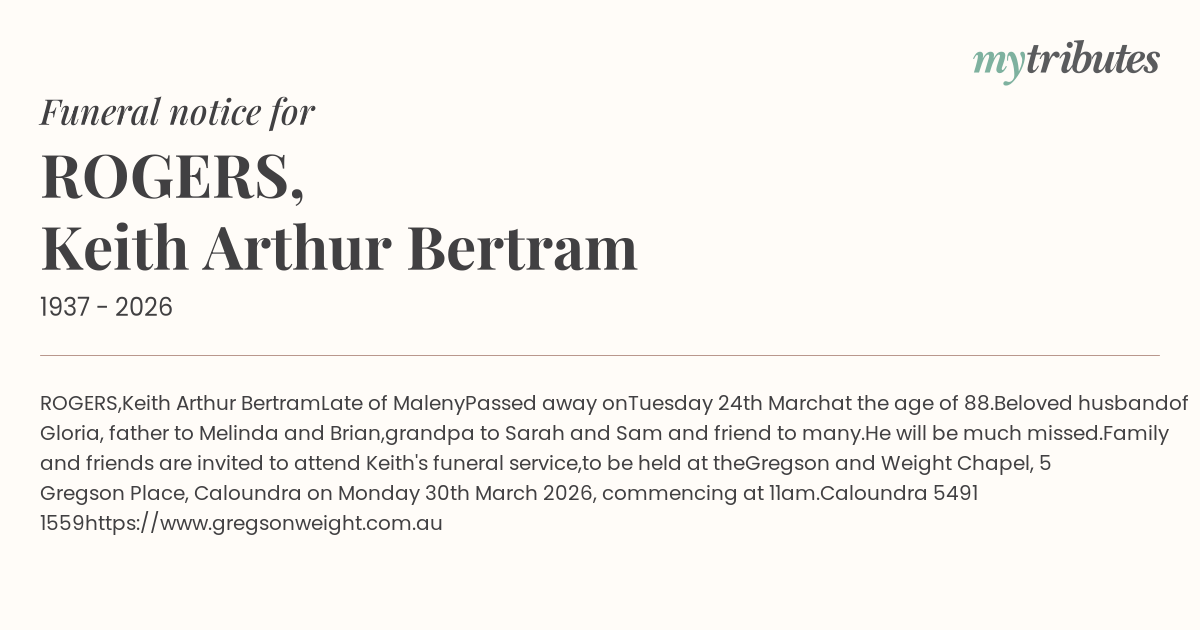 Gregson and Weight Chapel, 5 Gregson Place, Caloundra on Monday 30th March 2026, commencing at 11am.