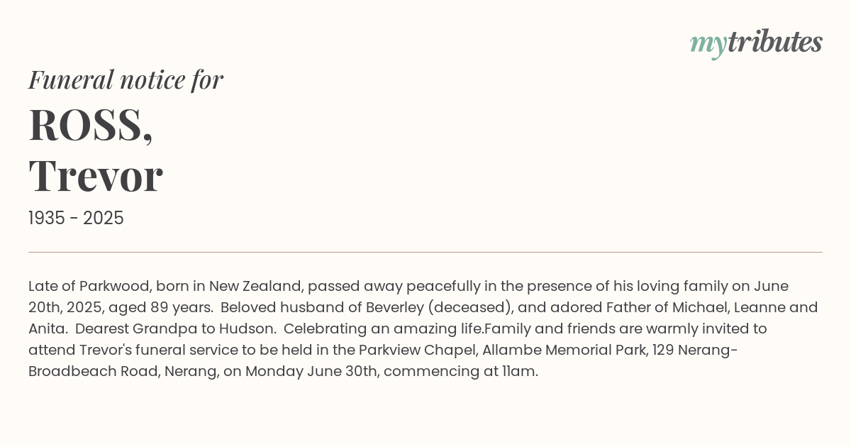 Family and friends are warmly invited to attend Trevor's funeral service to be held in the Parkview Chapel, Allambe Memorial Park, 129 Nerang-Broadbeach Road, Nerang, on Monday June 30th, commencing at 11am.