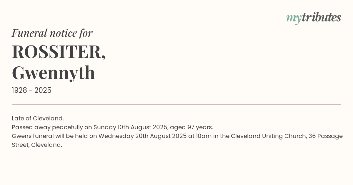 Gwen’s funeral will be held on Wednesday 20th August 2025 at 10am in the Cleveland Uniting Church, 36 Passage Street, Cleveland.