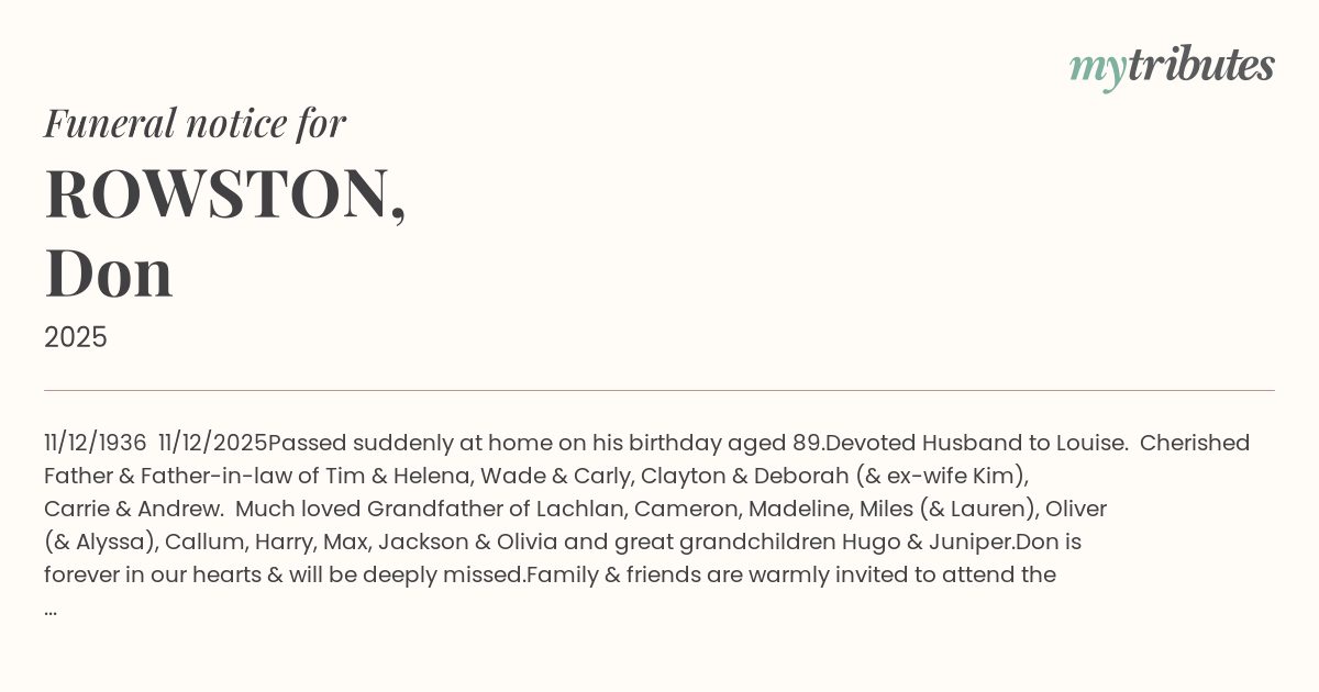 Devoted Husband to Louise. Cherished Father & Father-in-law of Tim & Helena, Wade & Carly, Clayton & Deborah (& ex-wife Kim), Carrie & Andrew. Much loved Grandfather of Lachlan, Cameron, Madeline, Miles (& Lauren), Oliver (& Alyssa), Callum, Harry, Max, Jackson & Olivia and great grandchildren Hugo & Juniper.