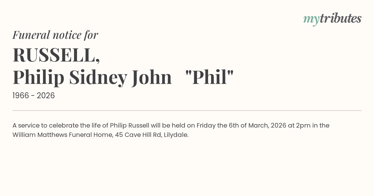15°CA service to celebrate the life of Philip Russell will be held on Friday the 6th of March, 2026 at 2pm in the William Matthews Funeral Home, 45 Cave Hill Rd, Lilydale.