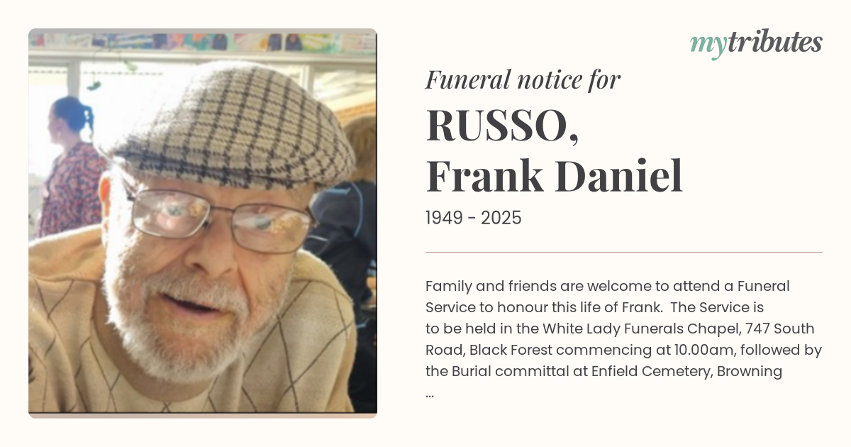 15°CFamily and friends are welcome to attend a Funeral Service to honour this life of Frank. The Service is to be held in the White Lady Funerals Chapel, 747 South Road, Black Forest commencing at 10.00am, followed by the Burial committal at Enfield Cemetery, Browning Street, Clearview.