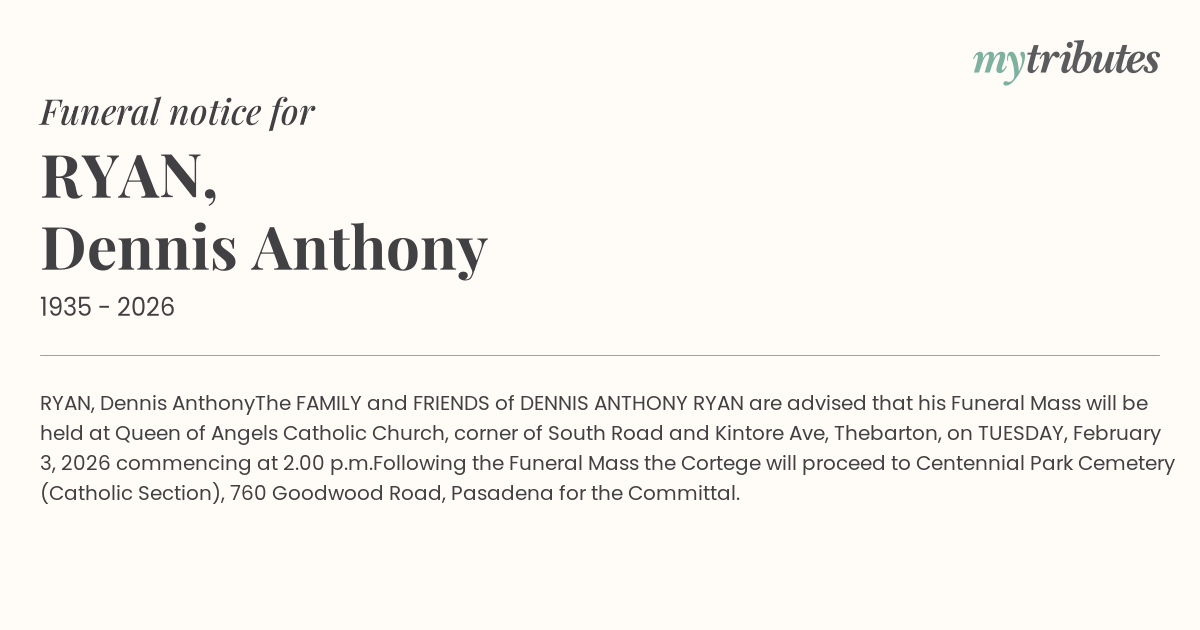 The FAMILY and FRIENDS of DENNIS ANTHONY RYAN are advised that his Funeral Mass will be held at Queen of Angels Catholic Church, corner of South Road and Kintore Ave, Thebarton, on TUESDAY, February 3, 2026 commencing at 2.00 p.m.