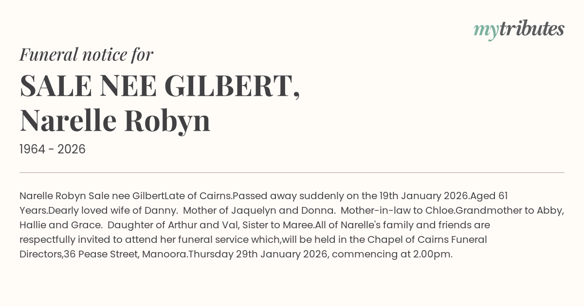 All of Narelle's family and friends are respectfully invited to attend her funeral service which,