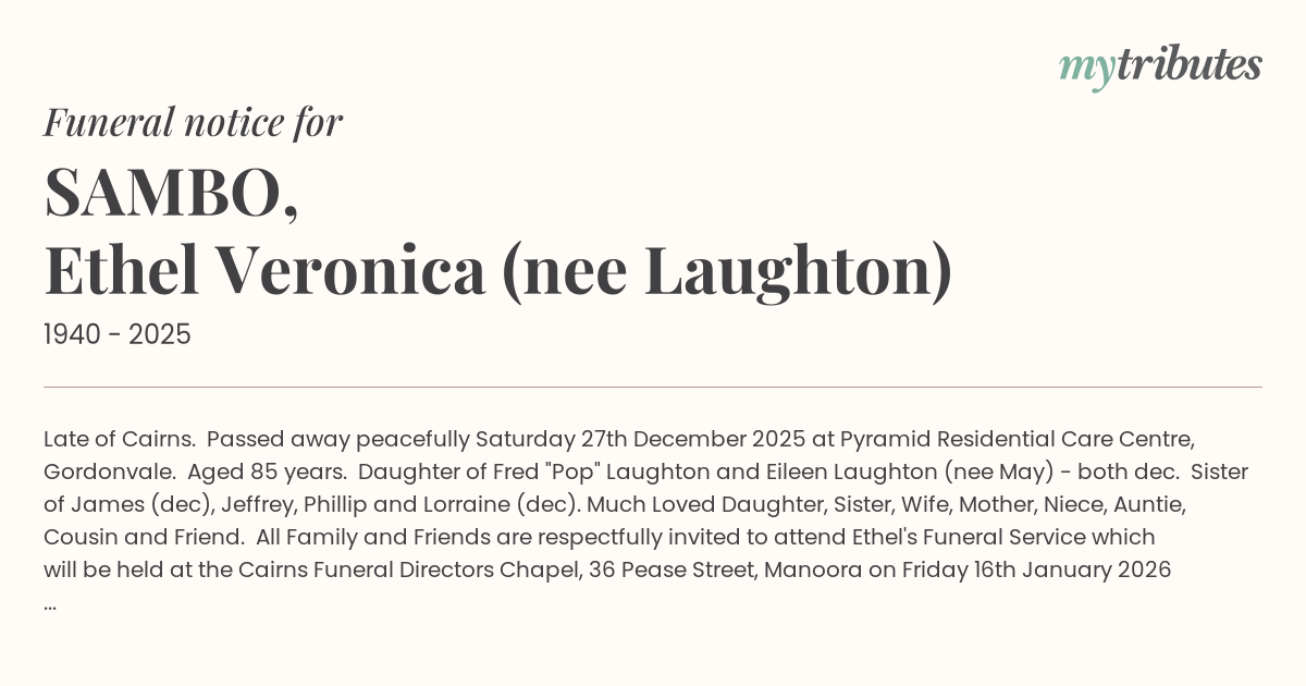 All Family and Friends are respectfully invited to attend Ethel's Funeral Service which will be held at the Cairns Funeral Directors Chapel, 36 Pease Street, Manoora on Friday 16th January 2026 commencing at 10:00am.