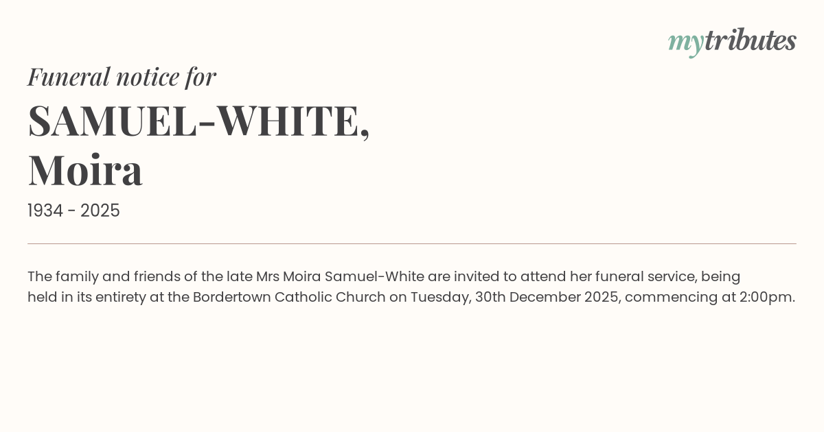 15°CThe family and friends of the late Mrs Moira Samuel-White are invited to attend her funeral service, being held in its entirety at the Bordertown Catholic Church on Tuesday, 30th December 2025, commencing at 2:00pm.