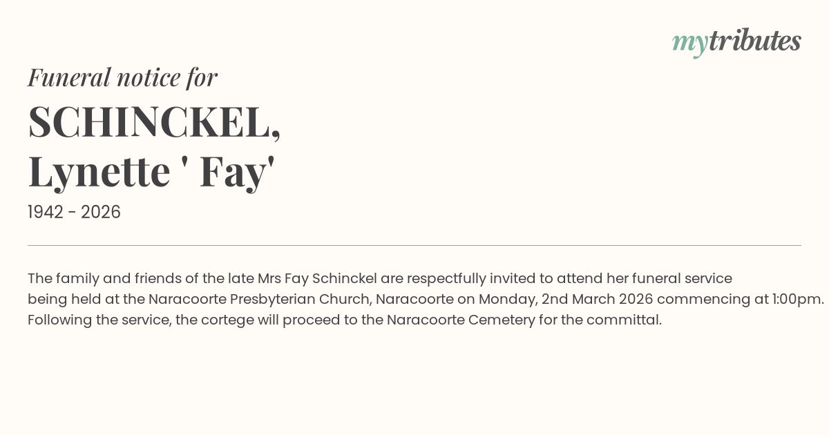15°CThe family and friends of the late Mrs Fay Schinckel are respectfully invited to attend her funeral service being held at the Naracoorte Presbyterian Church, Naracoorte on Monday, 2nd March 2026 commencing at 1:00pm.