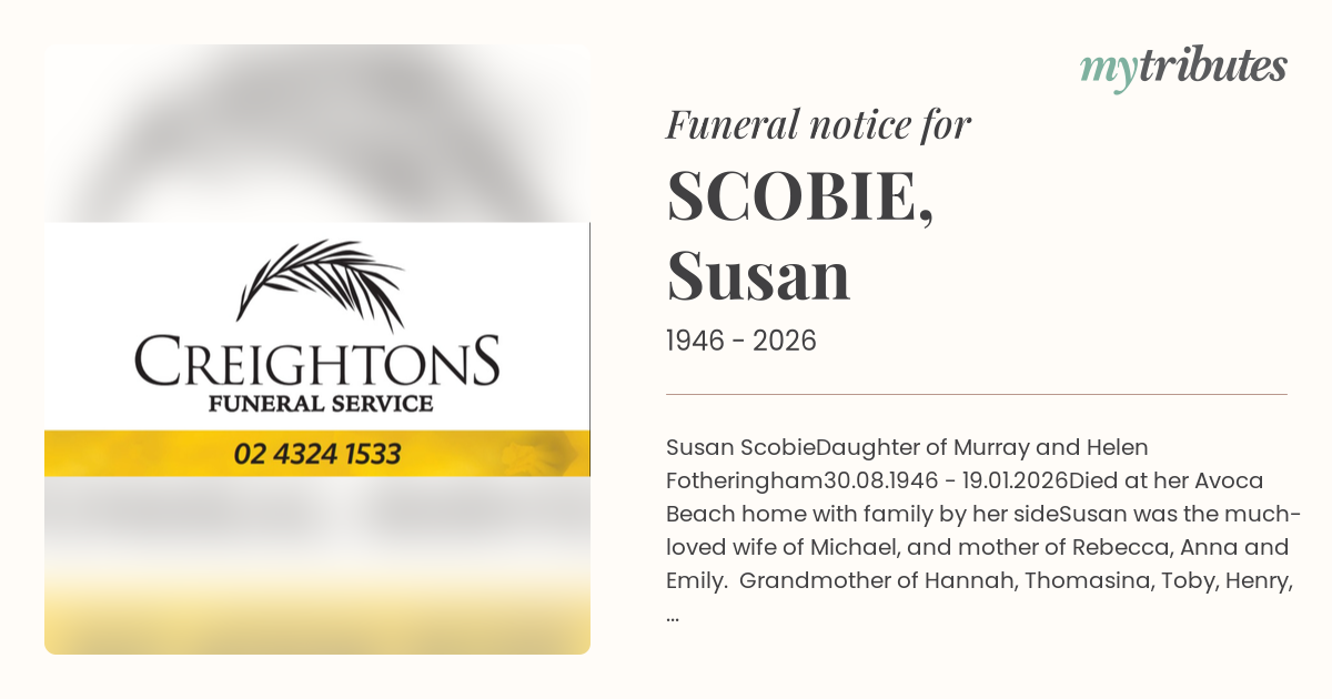 Susan was the much-loved wife of Michael, and mother of Rebecca, Anna and Emily. Grandmother of Hannah, Thomasina, Toby, Henry, Edie, Angus, Molly and Monty. Sister of Rob and Mary.