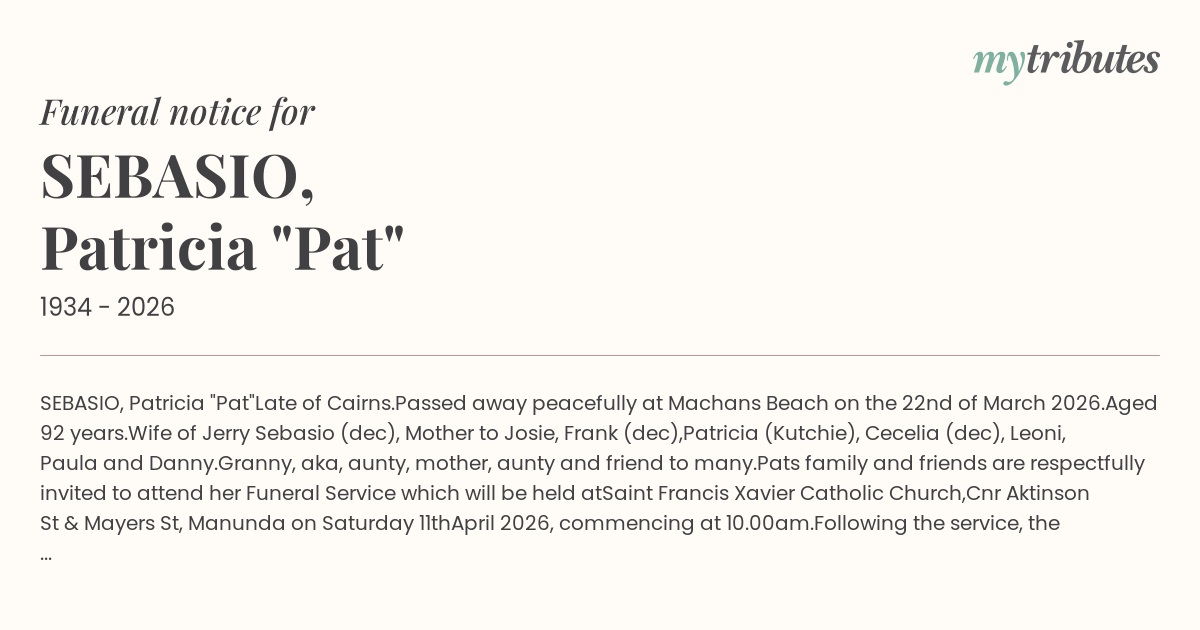 Pat’s family and friends are respectfully invited to attend her Funeral Service which will be held at