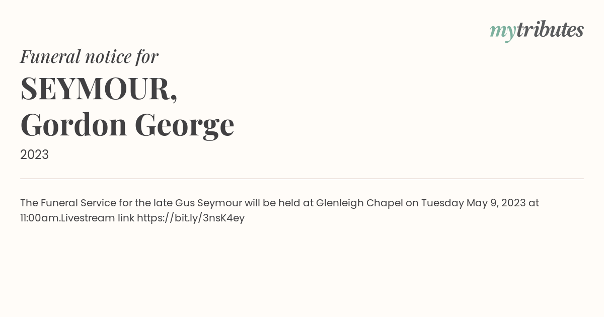 15°CThe Funeral Service for the late Gus Seymour will be held at Glenleigh Chapel on Tuesday May 9, 2023 at 11:00am.