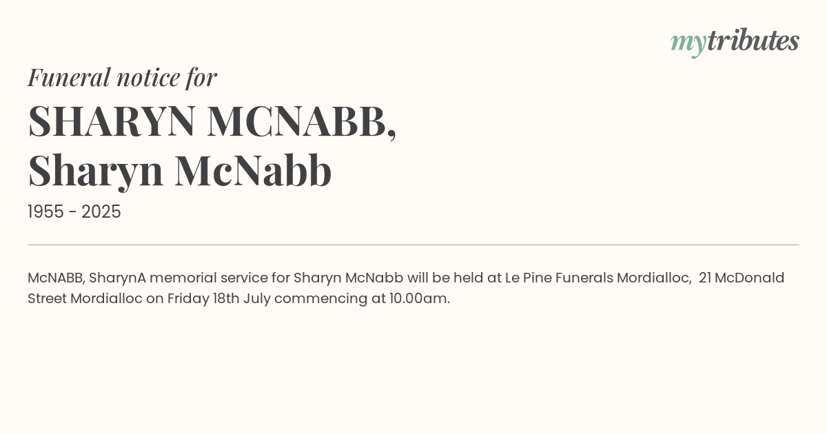 A memorial service for Sharyn McNabb will be held at Le Pine Funerals Mordialloc, 21 McDonald Street Mordialloc on Friday 18th July commencing at 10.00am.