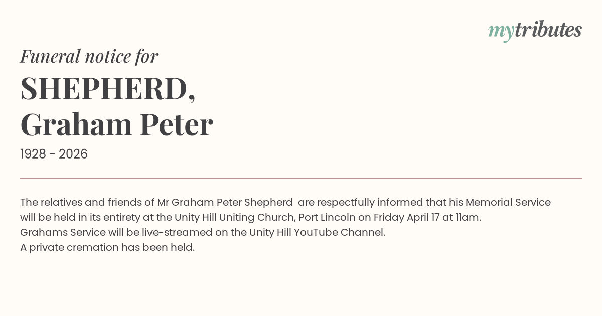 15°CThe relatives and friends of Mr Graham Peter Shepherd are respectfully informed that his Memorial Service will be held in its entirety at the Unity Hill Uniting Church, Port Lincoln on Friday April 17 at 11am.
