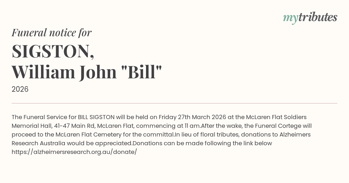 15°CThe Funeral Service for BILL SIGSTON will be held on Friday 27th March 2026 at the McLaren Flat Soldiers Memorial Hall, 41-47 Main Rd, McLaren Flat, commencing at 11 am.