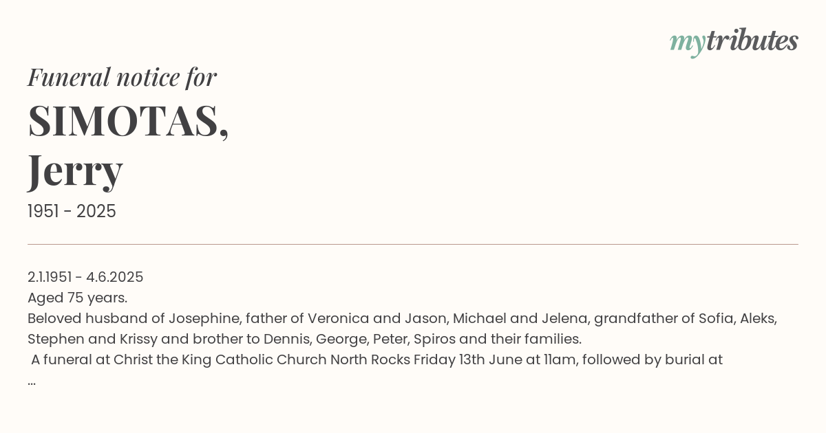 A funeral at Christ the King Catholic Church North Rocks Friday 13th June at 11am, followed by burial at Castle Hill Cemetery.