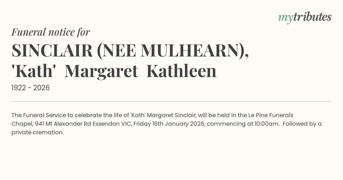 15°CThe Funeral Service to celebrate the life of 'Kath' Margaret Sinclair, will be held in the Le Pine Funerals Chapel, 941 Mt Alexander Rd Essendon VIC, Friday 16th January 2026, commencing at 10:00am. Followed by a private cremation.