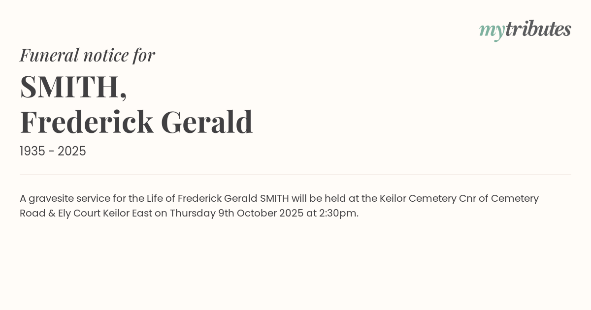 15°CA gravesite service for the Life of Frederick Gerald SMITH will be held at the Keilor Cemetery Cnr of Cemetery Road & Ely Court Keilor East on Thursday 9th October 2025 at 2:30pm.