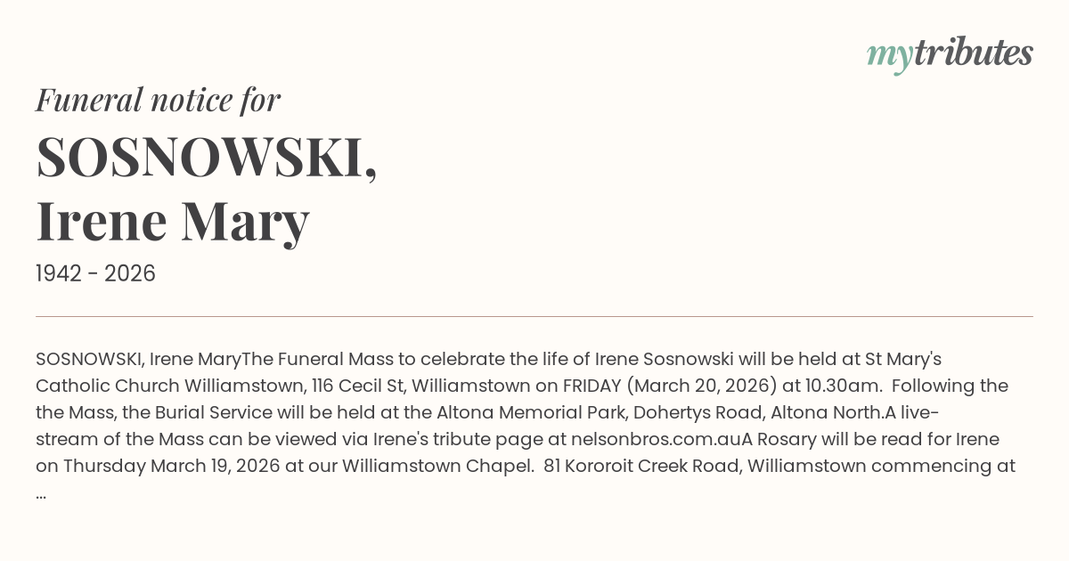 The Funeral Mass to celebrate the life of Irene Sosnowski will be held at St Mary's Catholic Church Williamstown, 116 Cecil St, Williamstown on FRIDAY (March 20, 2026) at 10.30am. Following the the Mass, the Burial Service will be held at the Altona Memorial Park, Dohertys Road, Altona North.