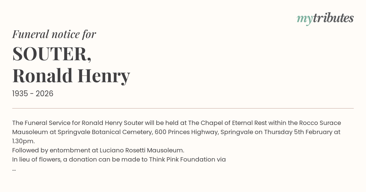 15°CThe Funeral Service for Ronald Henry Souter will be held at The Chapel of Eternal Rest within the Rocco Surace Mausoleum at Springvale Botanical Cemetery, 600 Princes Highway, Springvale on Thursday 5th February at 1.30pm.